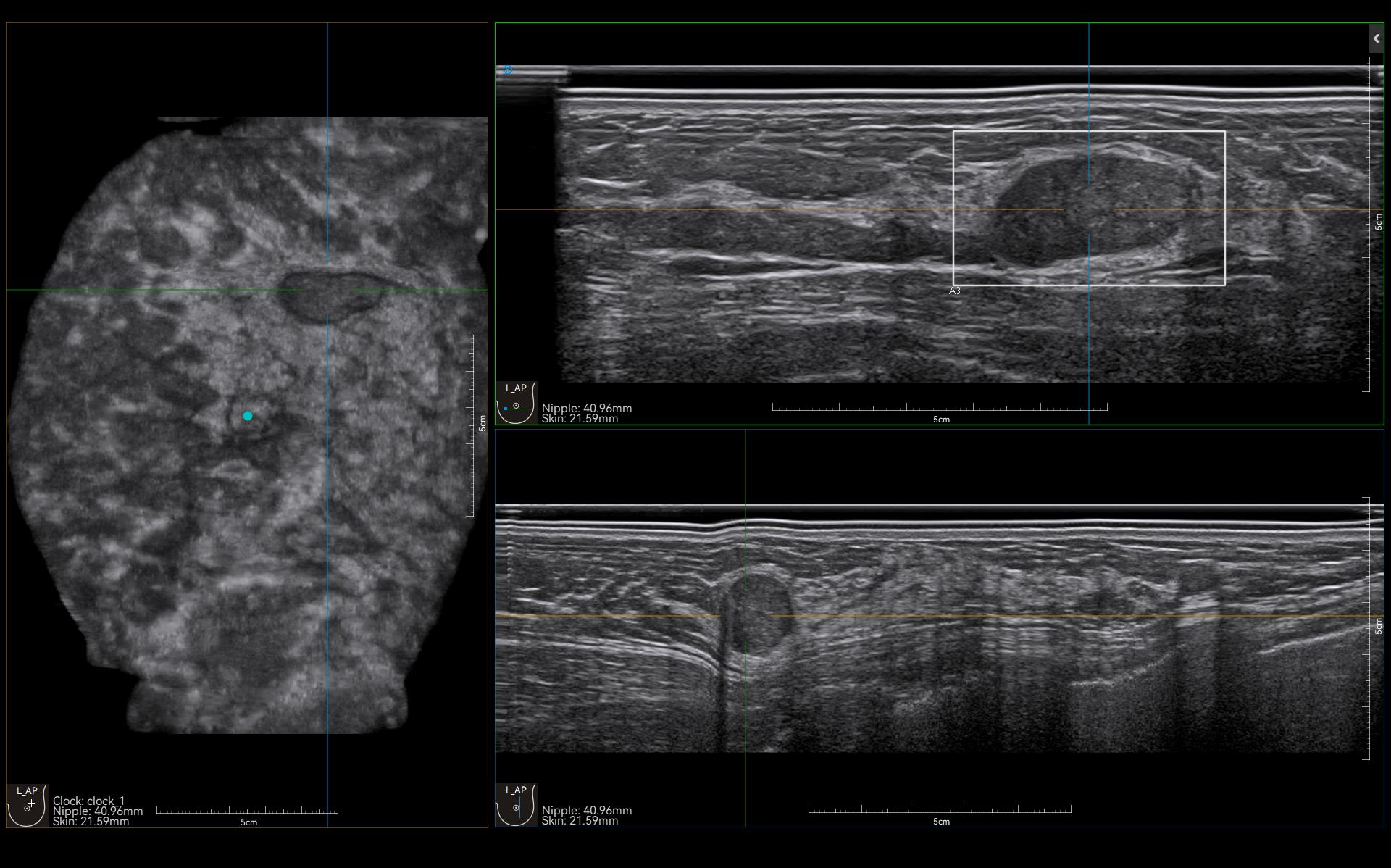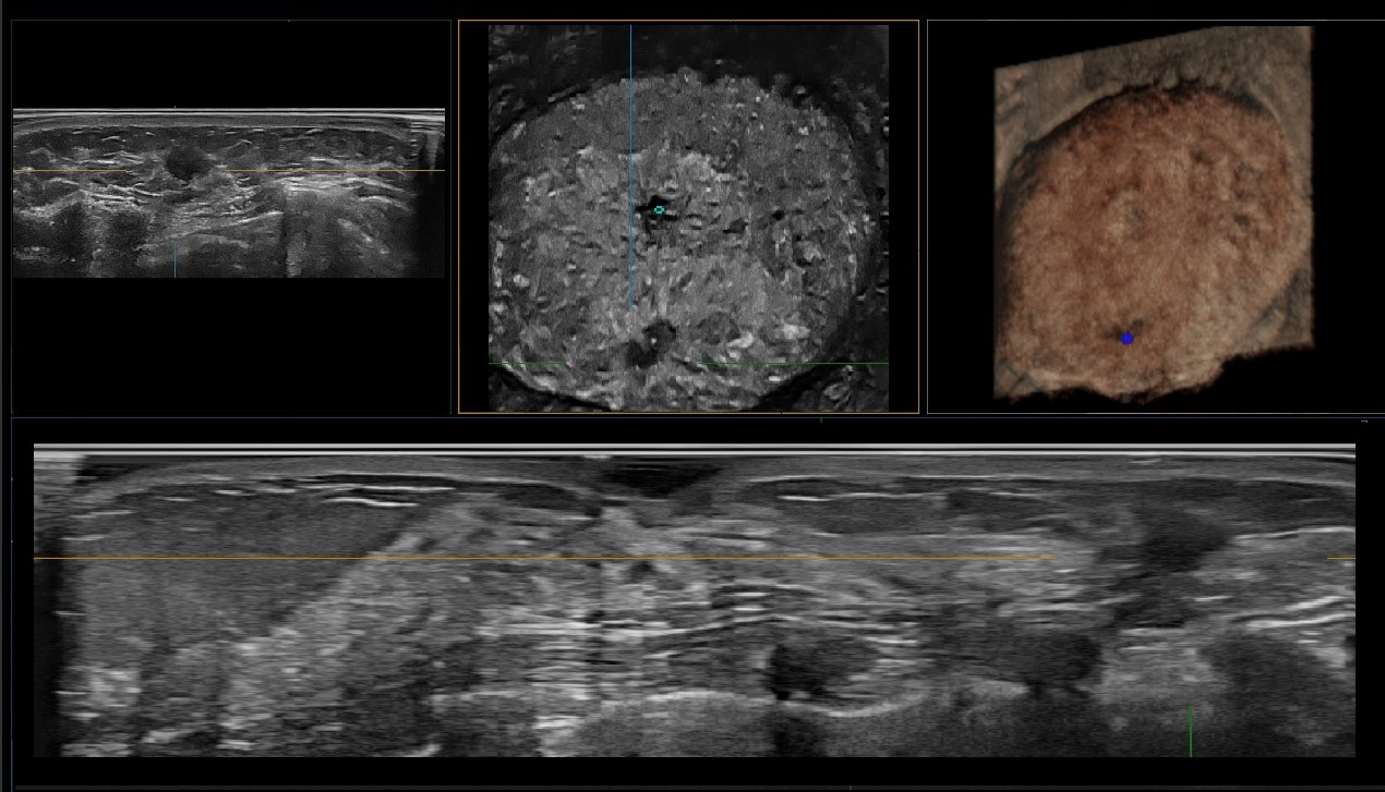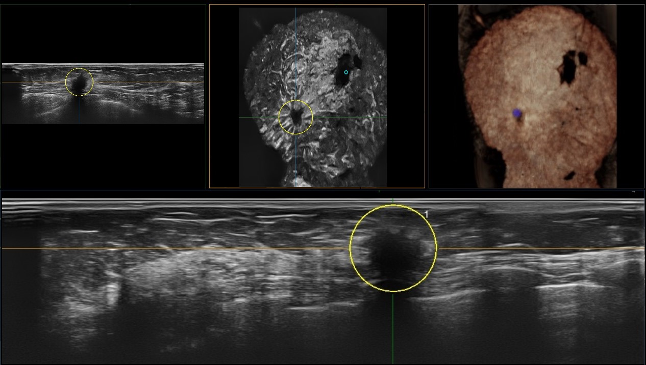 IBUS acquires volume data from multiple sections to provide abundant information. The coronal section intuitively shows the anatomical information of breast tissue in a supine position during operation, which helps surgeon to perform more accurate surgical planning.