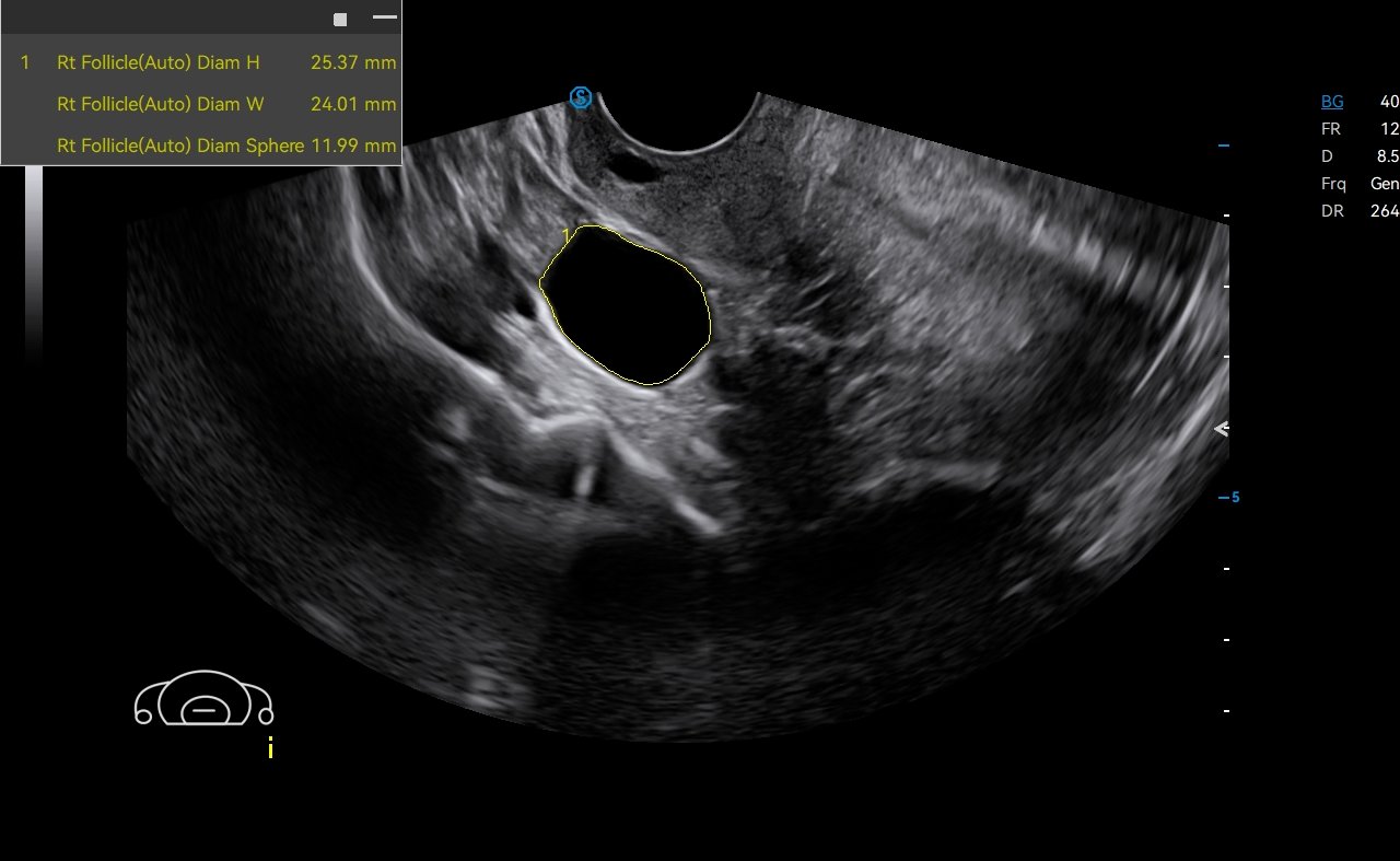 Auto OB automatically measures the common fetal biometric results (HC, BPD, FL, etc.) in standard sections.