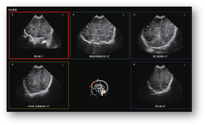 Craniocerebral Ultrasound Tomography (Infant) automatically identifies the 12 standard craniocerebral sections of the pediatric brain through volume data