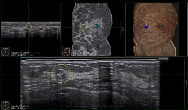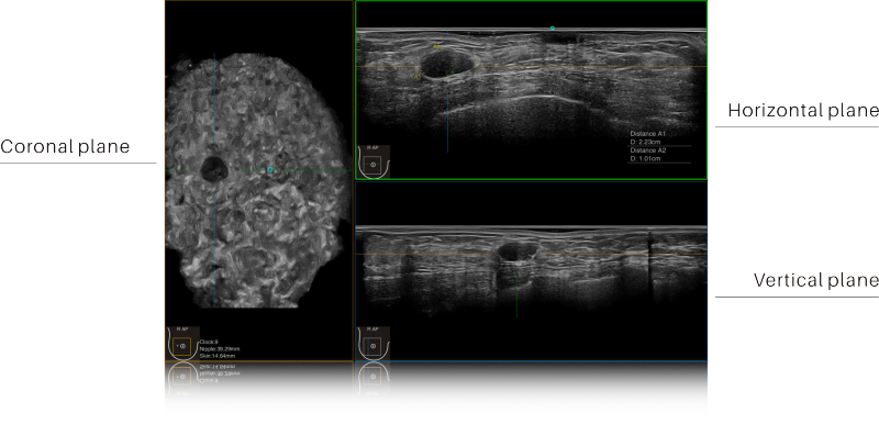 IBUS acquires volume data from multiple sections to provide abundant information. The coronal section intuitively shows the anatomical information of breast tissue in a supine position during operation, which helps surgeon to perform more accurate surgical planning.