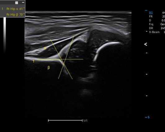 Auto Hip identifies the baseline, tracks the top line of bone and cartilage, and measures crucial results for hip dysplasia evaluation.